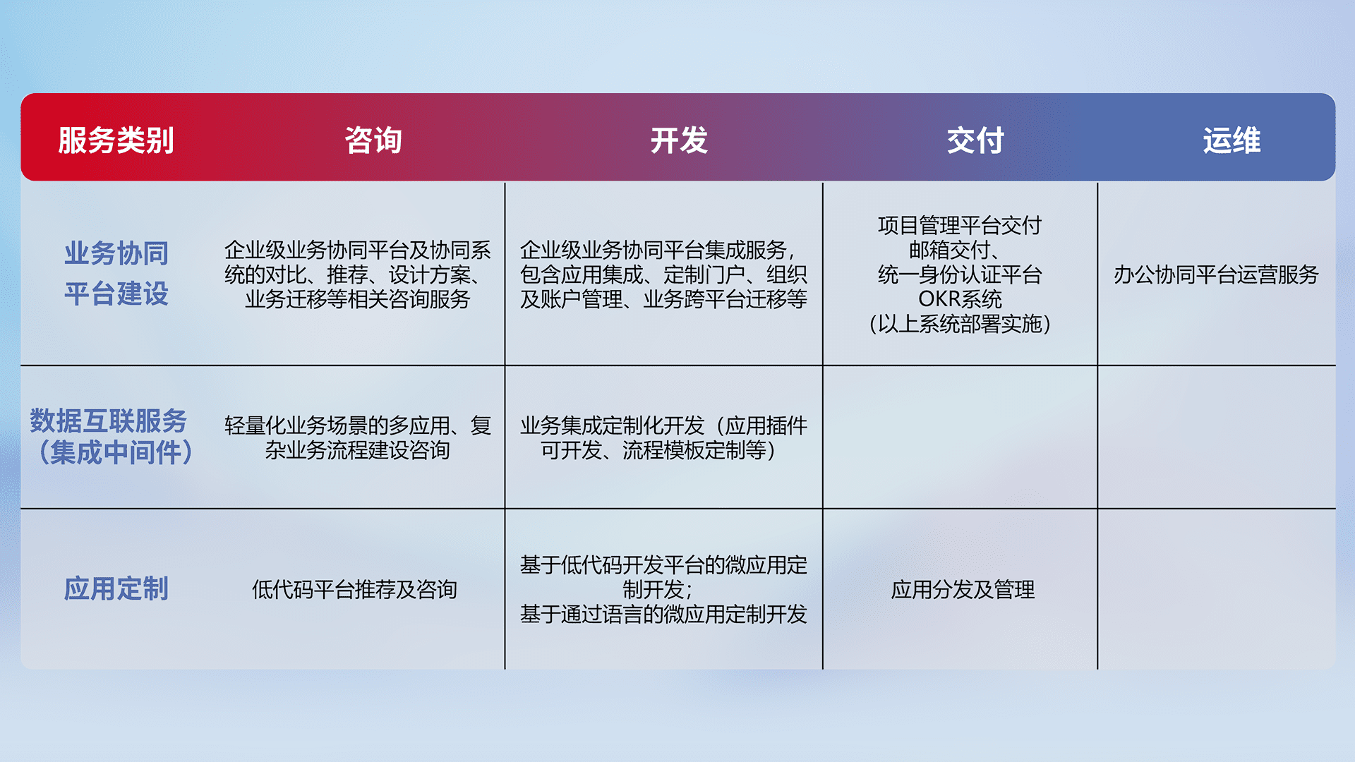 针对钉钉、、、企微、、IDaas等平台级产品提供产品的规划、、、、方案、、交付、、、、定制化开发等服务,,实现如统一协同办公、、、智能客户服务、、、、混合会议管理、、、、智能数据查询、、、、等业务场景,,,实现数字化转型。。。