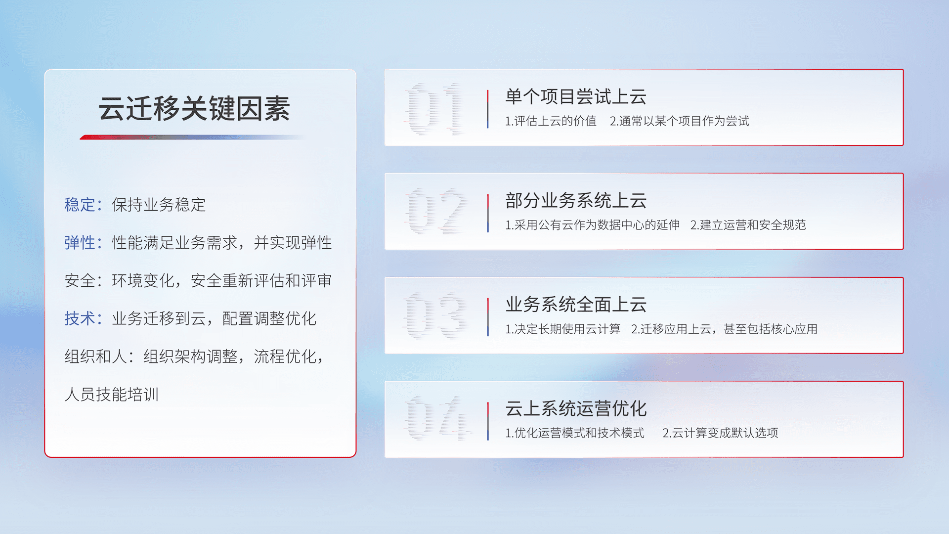 结合实际业务,,,从规划设计、、、云平台选型、、云原生改造、、数据迁移、、、、集成交付,,迁移全过程为客户识别最佳上云路径,,,做好风险识别管理,,,,设计网络架构、、、、身份权限、、、安全审计合规、、、、操作审计、、、、日志审计、、监控告警策略、、、多站点容灾设计等,,,对云上基础设施进行整体规划,,,提升IT治理水平,,,以满足弹性、、、高可用、、、高性能的需求。。。