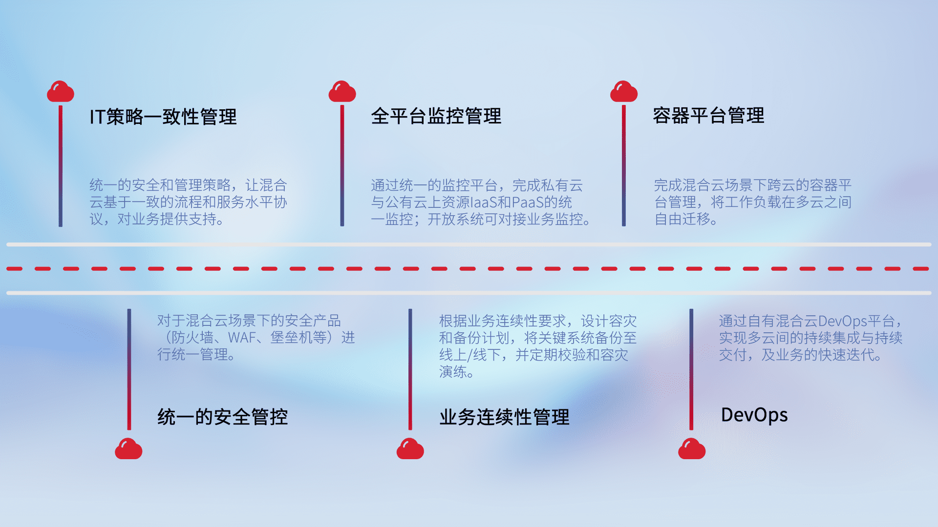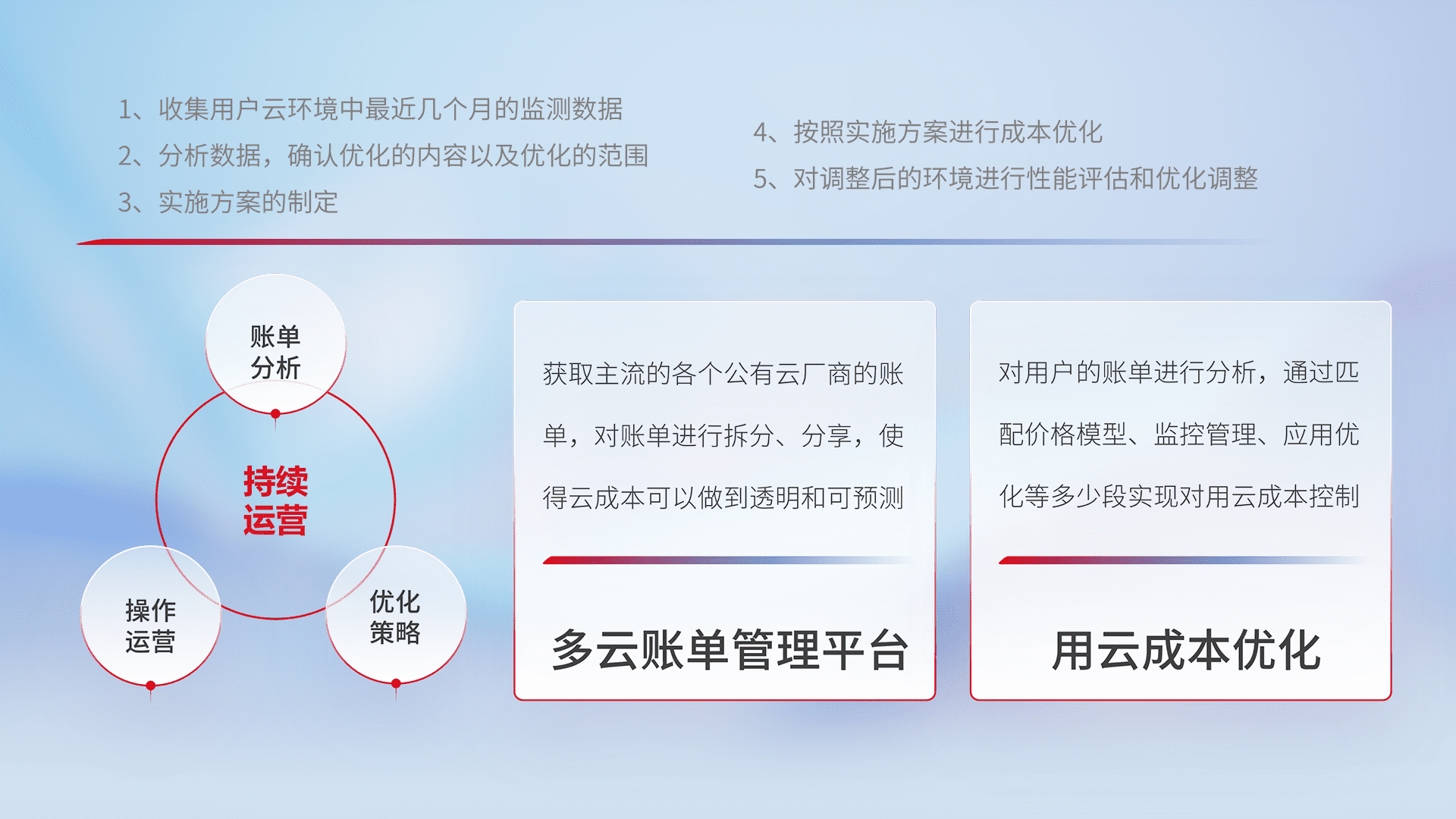 通过多云纳管,,,,以统一的资源数据模型把客户的云资源进行抽象和封装,,进而实现对多云资源的统一操作,,,保障云资源管理的可靠性、、稳定性与可用性。。。。量身定制化运维内容,,,,配置、、、开发运维、、、、补丁管理、、、备份、、监控、、认证和访问管理、、审计和日常巡检等,,保障在用云过程中的可靠度,,,稳定度以及高可用率。。。。